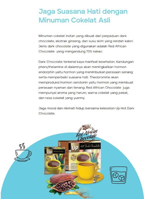 Dia juga menambahkan dark chocolate jenis Red Africans mempunyai aroma yang harum, warna cokelat yang pekat dan rasa coklat yang yummy. Susu skim di dalamnya membuat rendah lemak dan rendah kalori. “Segala manfaat cokelat bagi kesehatan otak, ada di Up Hot Dark Chocolate!” tutup Chendra.